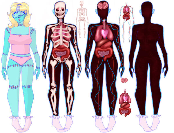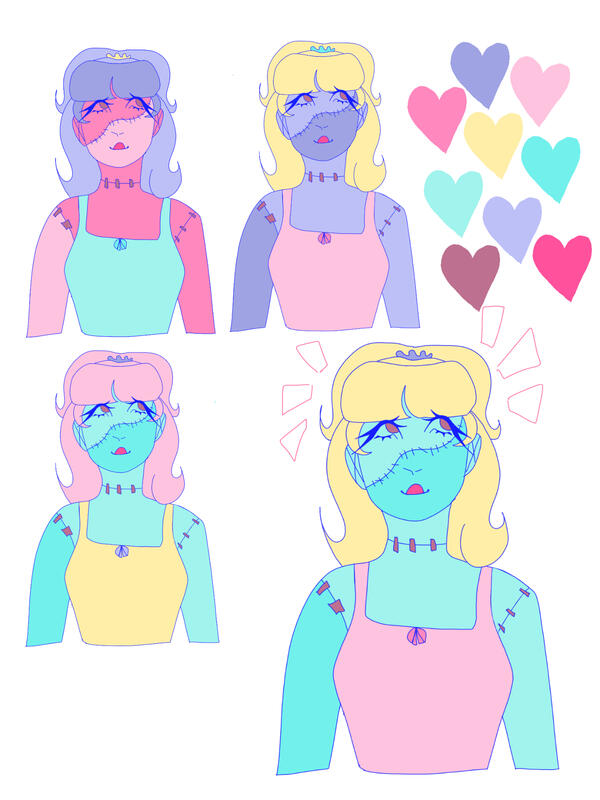 Trying out different colours for the franken-girl. I eventually decided on a mash-up of almost all of them.