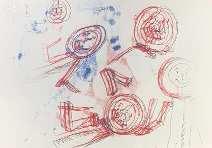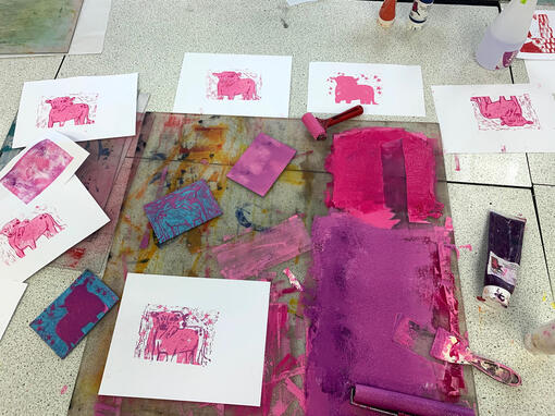 Lino print outcomes and the mess I made trying to make the cow print in the top corner.
