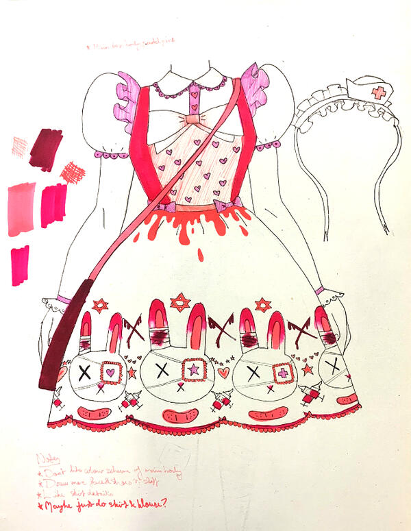 For this project, I picked the theme of doing menhera and yamikawaii style mixed with Lolita fashion. My initial plan was to print a skirt, but I didn't get enough chance to do that past making a first pass.