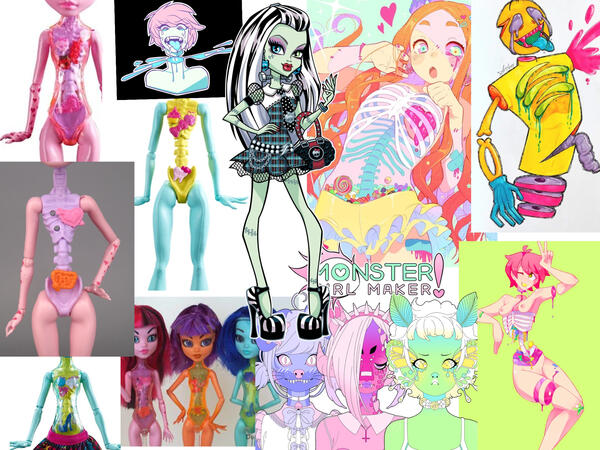Trying out different colours for the franken-girl. I eventually decided on a mash-up of almost all of them.