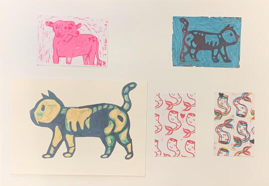 Lino print outcomes and the mess I made trying to make the cow print in the top corner.